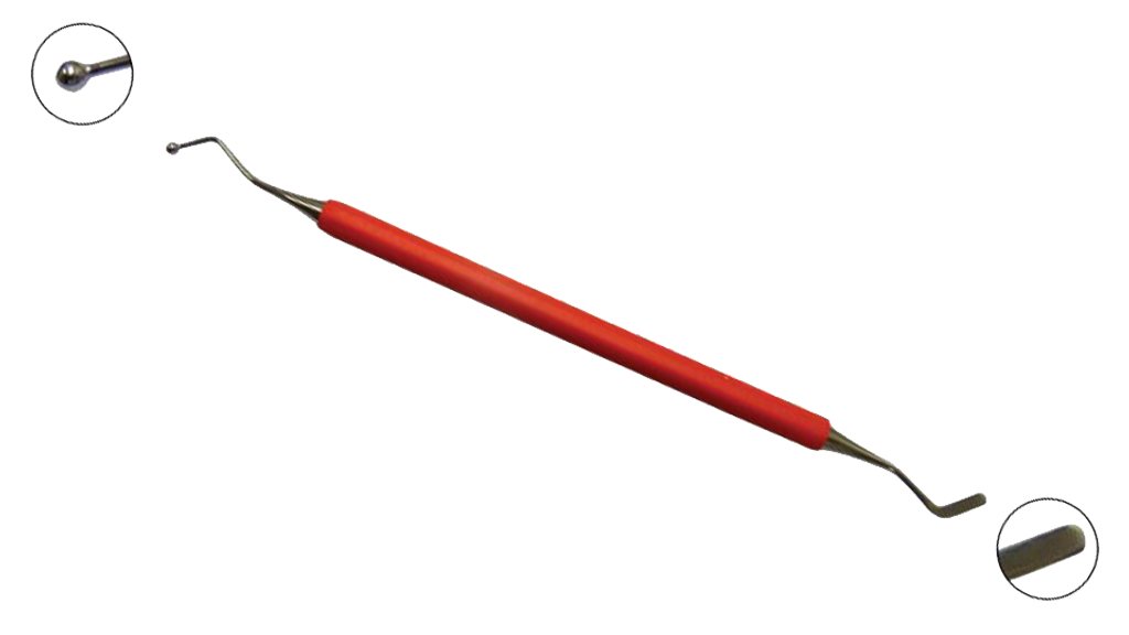 Verktyget är inspirerat av en tandläkares instrument, vilket gör det både precist och skonsamt. Den röda spetsen är tillverkad av ett flexibelt men tåligt material, vilket gör det möjligt att arbeta effektivt utan att riskera repor eller skador på lacken.
