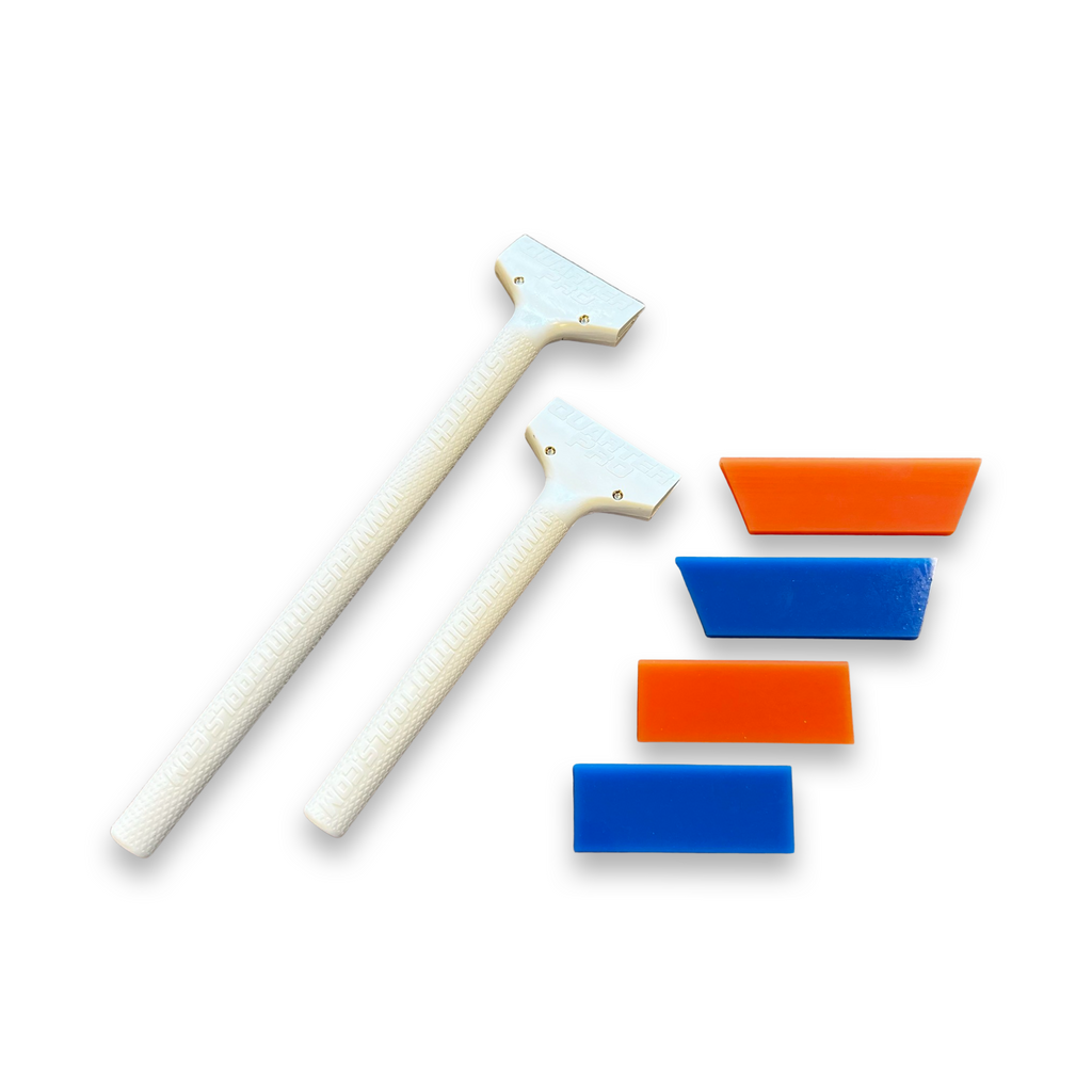 The Quarter Pro Handles come as a set which includes one Quarter Pro Handle (4.75 inches or 12.06 cm long), one Quarter Pro Stretch Handle (7 inches or 17.78 cm long), two soft orange squeegee blades, two hard blue squeegee blades, one squeegee blade handle jaw and one razor blade handle jaw. Both handles have a 1.5 inch (3.81 cm) wide squeegee jaw. The cropped squeegees included in the set are 2.5 inches (6.35 cm) wide by 0.75 inch (1.9 cm) and the square squeegees included in the kit are 1.75 inches (4.44 cm) by 0.75 inch (1.9 cm).