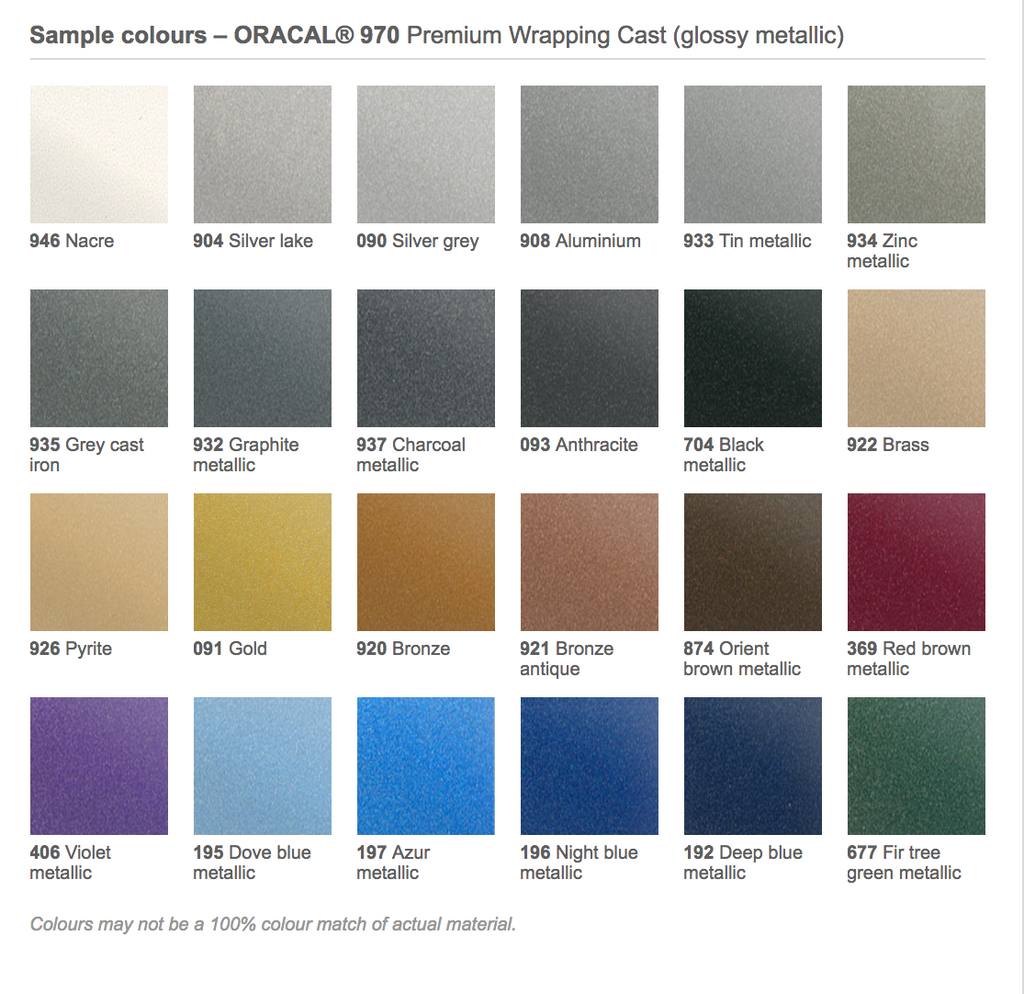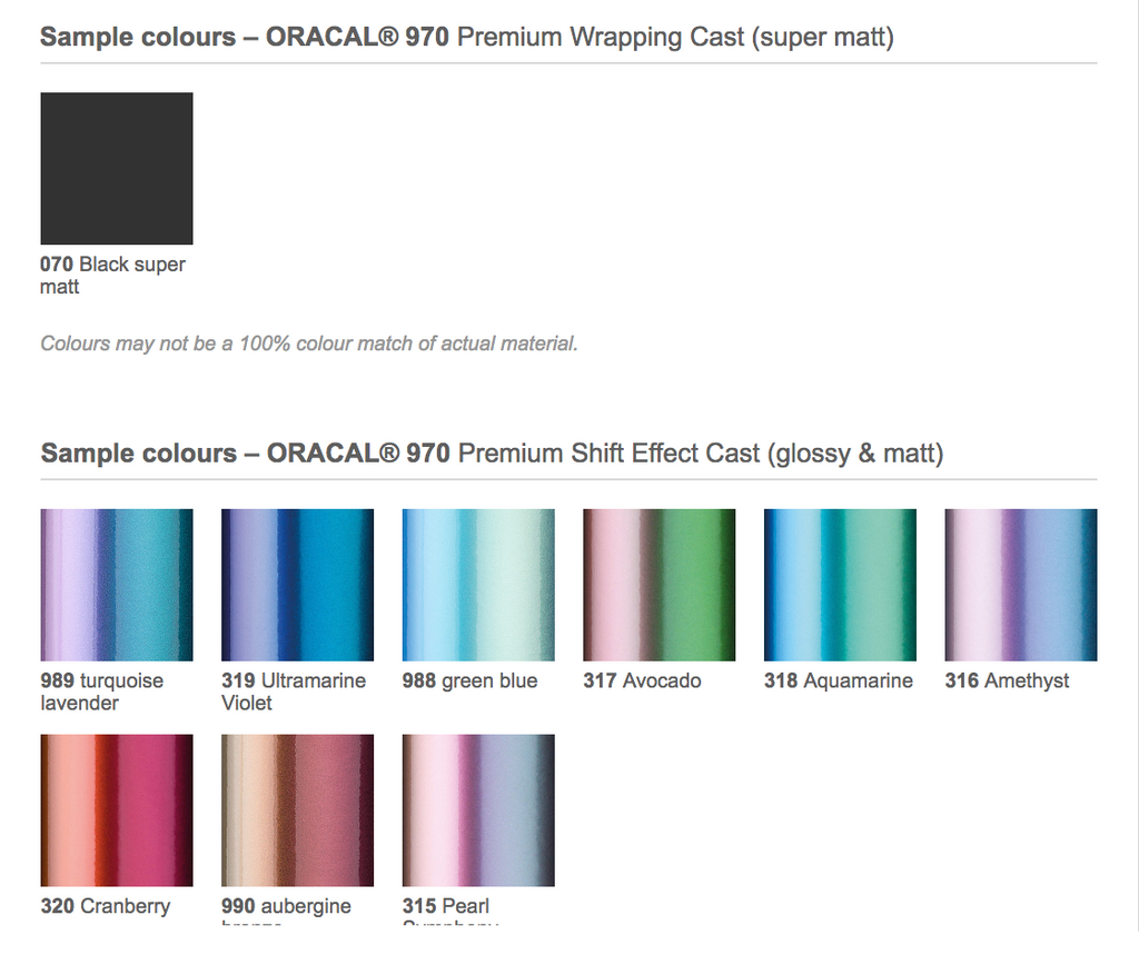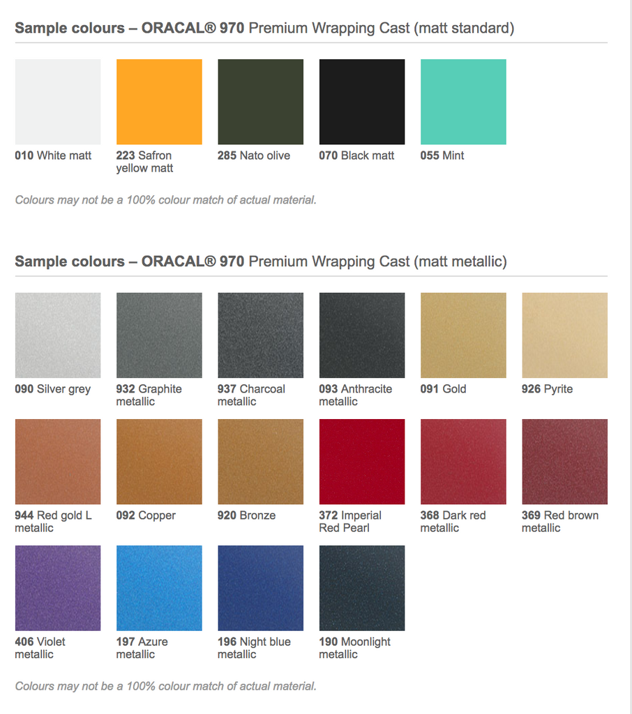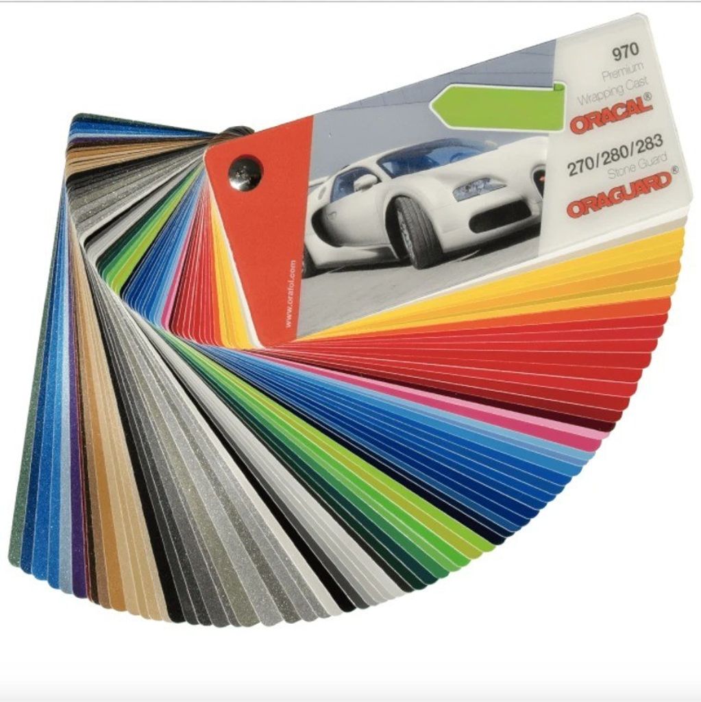 ORACAL 970 provkloss på samtliga vinyler i 970 serien. Blanka benämns med G efter 970 och Matt benämns med M efter 970. exempel: 970G-090 eller 970M-090